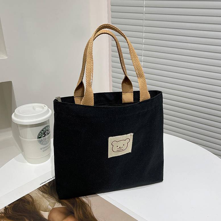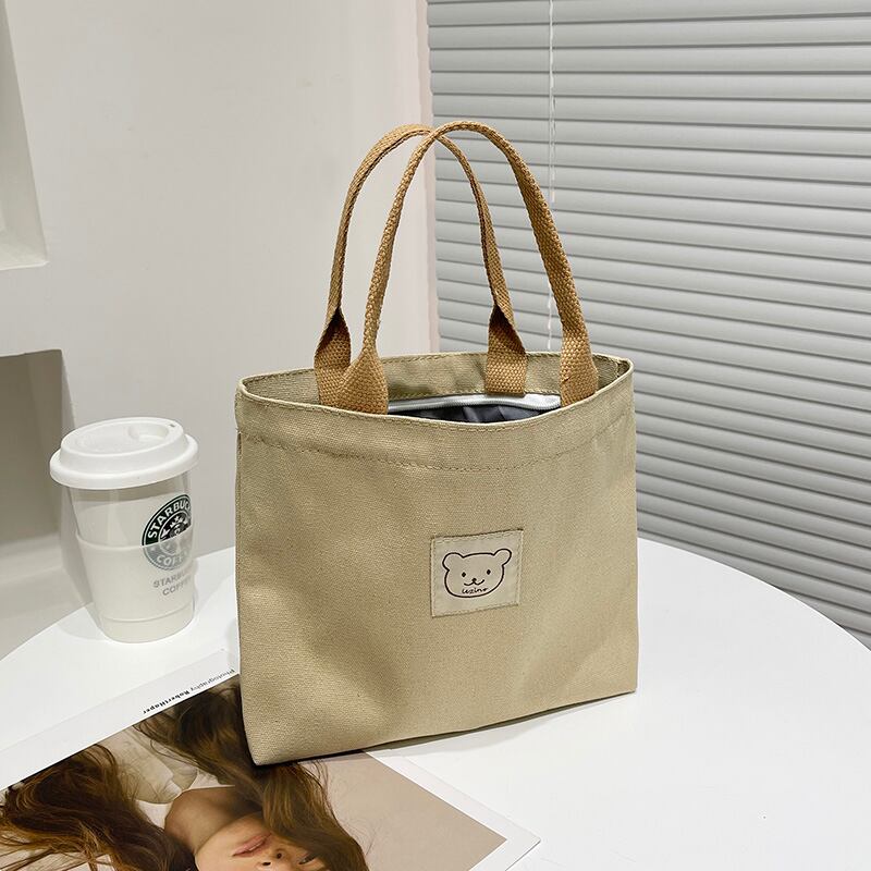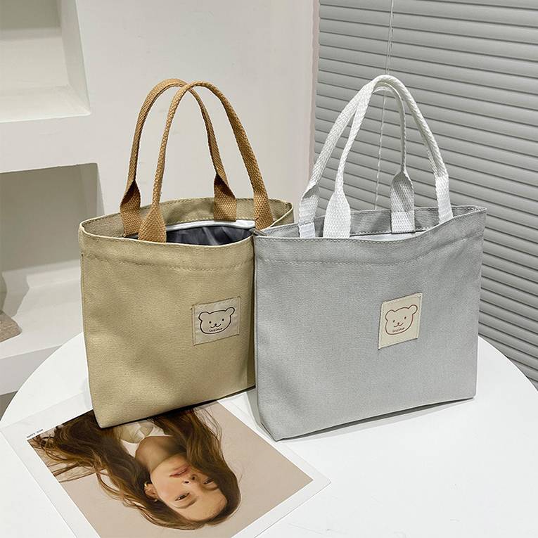 愛らしいくまパッチ付きミニトートバッグ ランチバッグ風 シンプルキャンバスバッグ レディース バッグ 小さめ 手提げ 韓国風 大人可愛い カジュアル 通勤通学 春夏 秋冬 使いやすい 4色展開 K-B0182