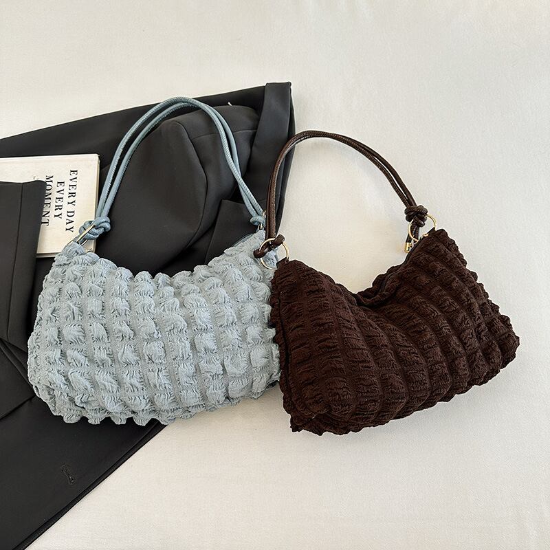 肌触り抜群のふわふわ生地が魅力のワンショルダーバッグ。表面は立体的な格子模様で、シンプルながら個性をプラス。カジュアルからフェミニンなコーデまで幅広くマッチする万能アイテムです。
