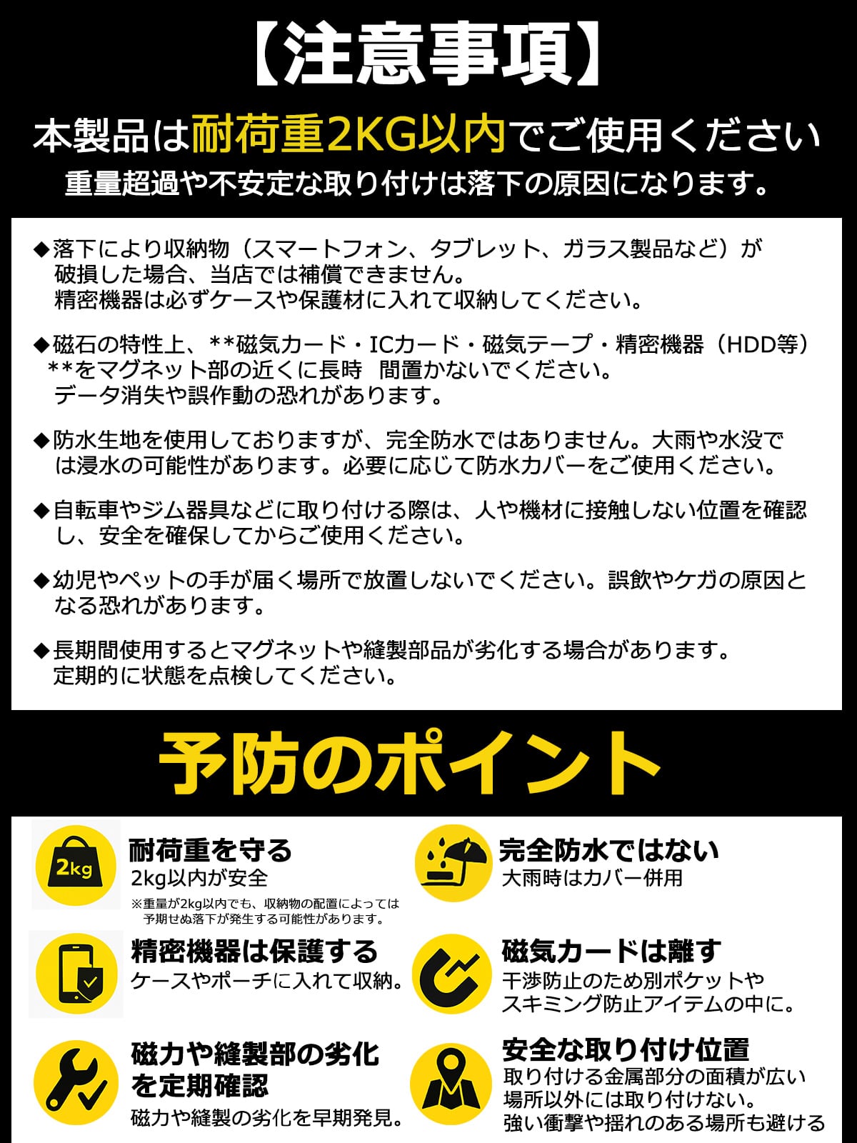 ・運動中や強い衝撃が加わった場合、バッグが外れる可能性があります。必ず安全な位置に固定し、使用前には吸着状態を確認してください。