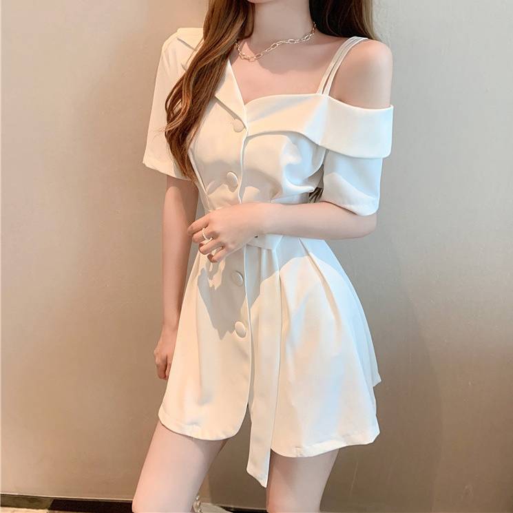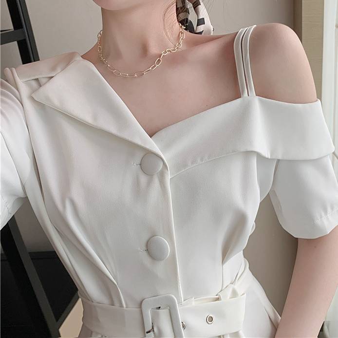 レディース ワンピース オフショルダー ベルト付き ショート丈 半袖 2WAYデザイン フロントボタン セクシー 大人可愛い 韓国ファッション 春 夏 秋 通勤 デート カジュアル きれいめ ブラック ホワイト 2色展開 S M L XL 体型カバー ミニワンピース C-OSS0168