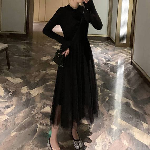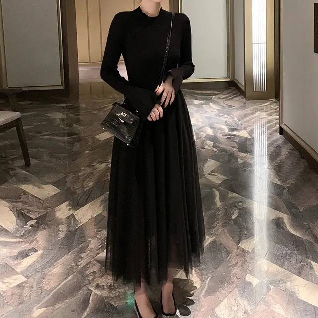 歩くたびにふんわりと揺れるチュールスカートが美しい、上品で落ち着いたブラックロングワンピース。シンプルな長袖トップスと軽やかな透け感チュールを合わせた異素材ミックスデザインで、大人の女性らしさを最大限に引き立てます。スタイルを綺麗に見せるウエスト位置の絶妙な切り替えが魅力で、細見え効果も抜群。