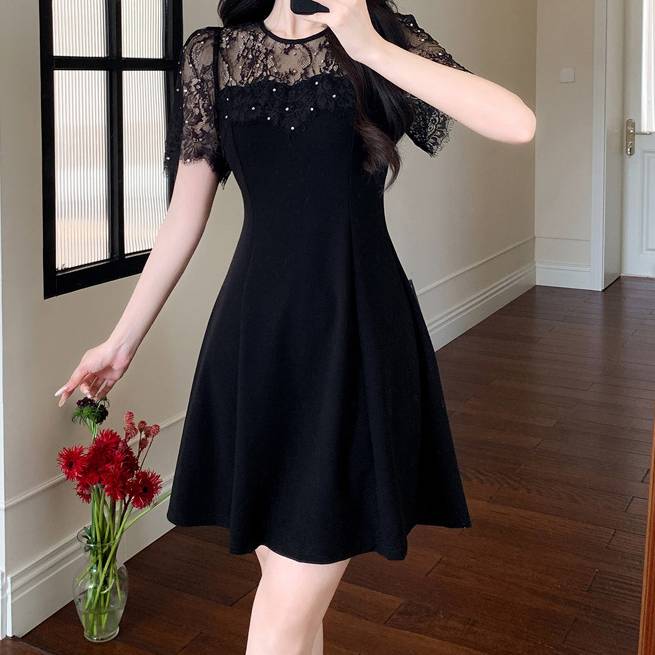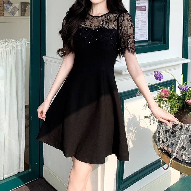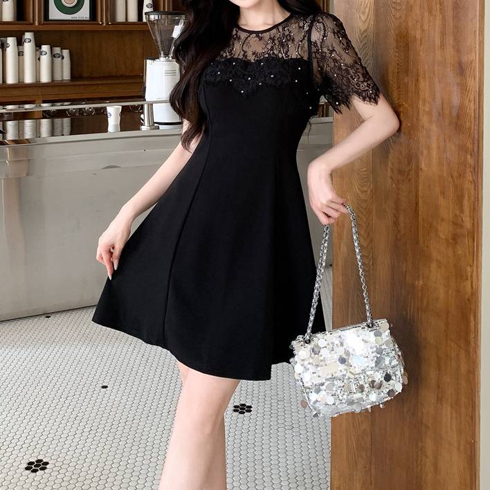 ブラック ワンピース レディース レース切り替え フレアワンピース ミニドレス 半袖 透け感 上品 きれいめ 大人可愛い エレガント 韓国ファッション デート お呼ばれ 二次会 パーティー 春 夏 秋 冬 オールシーズン 着回し フォーマル カジュアル おしゃれ 人気 トレンド C-OSS0195