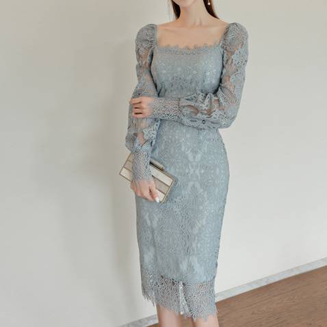レース ワンピース タイトドレス ミディ丈 長袖 レディース パーティードレス ライトブルー ブラック 上品 透け感 エレガント きれいめ セクシー 韓国風 二次会 披露宴 お呼ばれ デート 春夏 秋冬 通年 ドレスワンピ 結婚式 成人式 同窓会 大人可愛い 高級感 美シルエット C-OSS0184