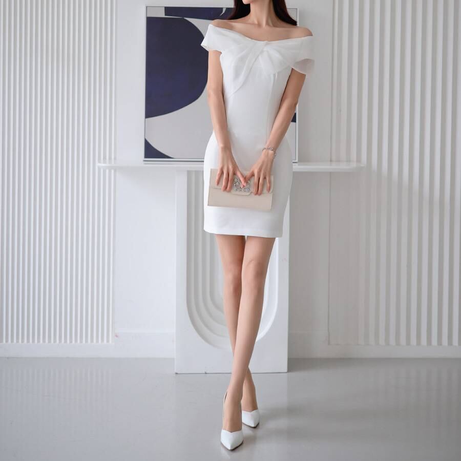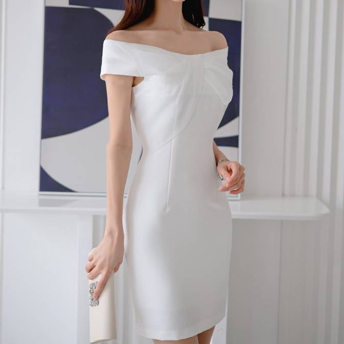レディース ワンピース オフショルダー タイト ミニドレス ホワイト フォーマル 結婚式 二次会 パーティー お呼ばれ 上品 清楚 韓国ファッション セクシー エレガント きれいめ 大人女子 体型カバー 春 夏 秋 冬 通年 美ライン 着痩せ効果 シンプルデザイン S M L XL C-OSS0177