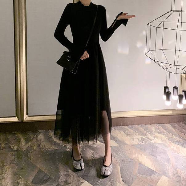 歩くたびにふんわりと揺れるチュールスカートが美しい、上品で落ち着いたブラックロングワンピース。シンプルな長袖トップスと軽やかな透け感チュールを合わせた異素材ミックスデザインで、大人の女性らしさを最大限に引き立てます。スタイルを綺麗に見せるウエスト位置の絶妙な切り替えが魅力で、細見え効果も抜群。