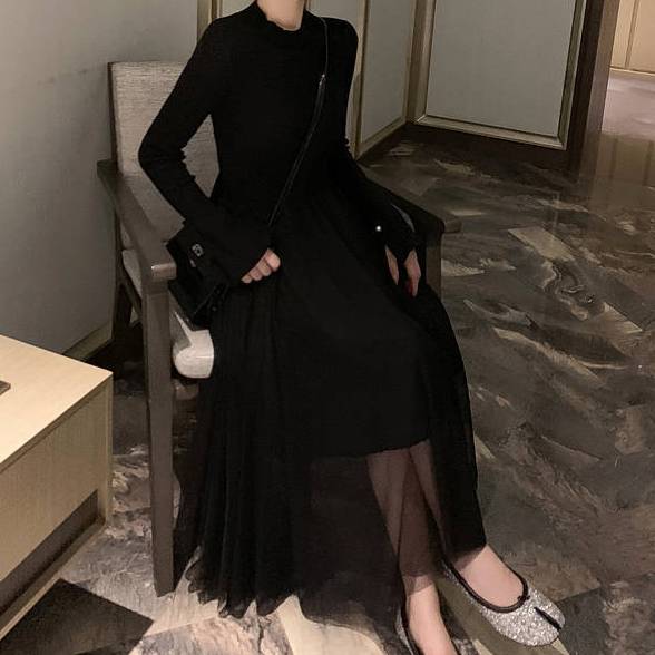 黒 ロングワンピース チュールワンピース ドレス レディース 長袖 きれいめ 上品 大人可愛い 黒ワンピ 秋冬 ふんわりチュール シアー 大人ワンピース エレガント おしゃれ シンプル 美シルエット 韓国風 ロング丈 20代 30代 40代 お呼ばれ デート ブラック C-OSS0222