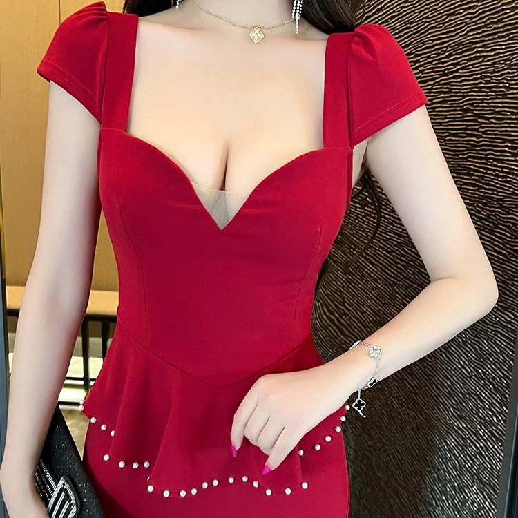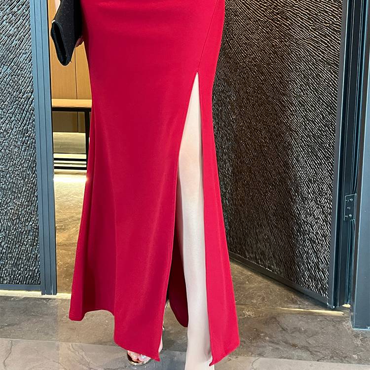 ブラック レッド ワンピース レディース ロングワンピース スリットドレス マーメイドライン パールベルト付き タイト エレガント セクシー フォーマル 上品 結婚式 二次会 パーティー お呼ばれ デート 高級感 大人きれい 美脚ライン ストレッチ 韓国ファッション 人気 春 夏 秋 冬 C-OSS0210