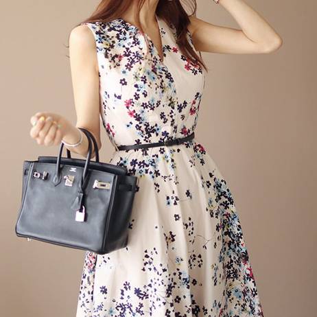華やかな花柄が印象的なベージュのノースリーブワンピース。