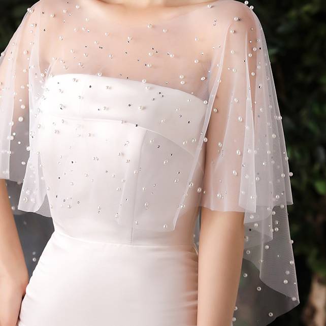 ウェディング ショール パール付き チュールケープ 花嫁 ボレロ ホワイト ケープ 羽織 結婚式 披露宴 二次会 前撮り ブライダル ドレス用 アクセサリー レディース シースルー 上品 可愛い エレガント ロマンチック ウエディング小物 フォーマル お呼ばれ 成人式 卒業式 C-OSS0181