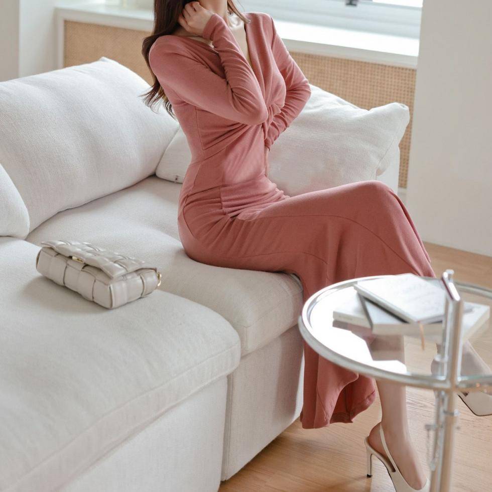 女性らしい上品なシルエットを引き立てる、ツイストデザインのロングワンピース。胸元のねじりディテールが立体感をつくり、ボディラインを美しく整えるタイト×マーメイドの完璧シルエット。長袖仕様で大人の落ち着きを演出しつつ、柔らかいニット素材が着心地の良さも叶えてくれます。