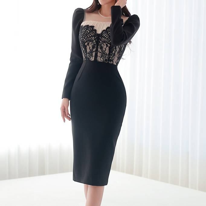ブラック ワンピース レディース タイトワンピース ミディ丈 長袖 レース シアー 上品 エレガント セクシー フォーマル パーティードレス 結婚式 二次会 きれいめ 美シルエット 韓国ファッション 大人可愛い 20代 30代 人気 高見え トレンド 春 夏 秋 冬 C-OSS0217
