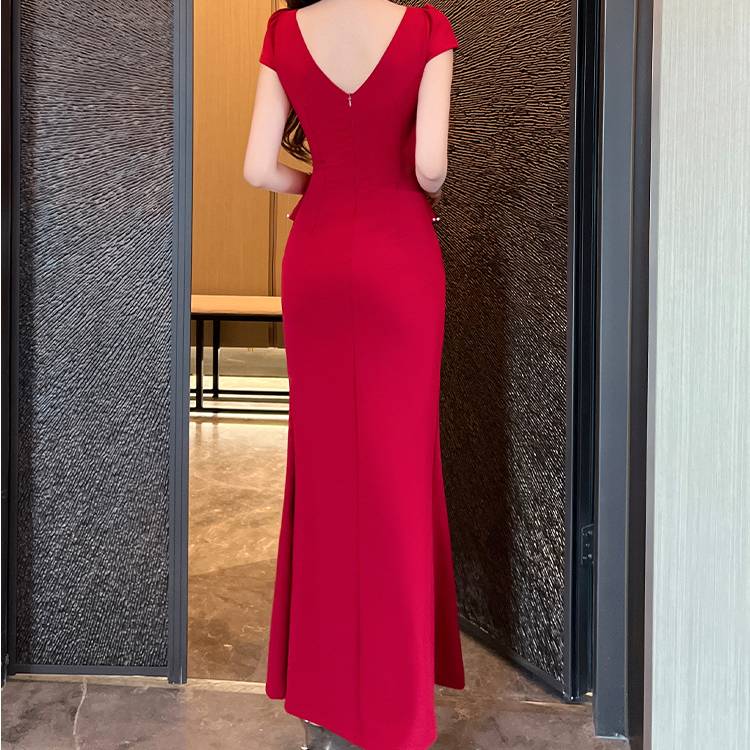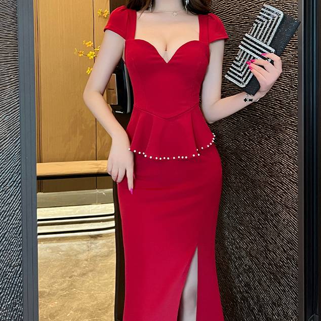 ブラック レッド ワンピース レディース ロングワンピース スリットドレス マーメイドライン パールベルト付き タイト エレガント セクシー フォーマル 上品 結婚式 二次会 パーティー お呼ばれ デート 高級感 大人きれい 美脚ライン ストレッチ 韓国ファッション 人気 春 夏 秋 冬 C-OSS0210