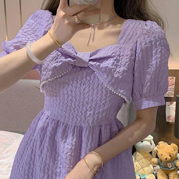ブラック パープル ホワイト ワンピース レディース ミニ丈 パフスリーブ パール リボンデザイン Aライン フェミニン ガーリー 韓国ファッション 春 夏 秋 デート 通学 カフェ お呼ばれ 清楚 ガーリーコーデ 可愛い きれいめ 人気 トレンド 高見え シンプル エレガント C-OSS0203