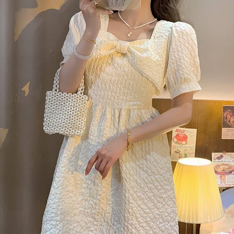 商品名:パールリボンデザイン パフスリーブ ミニワンピース