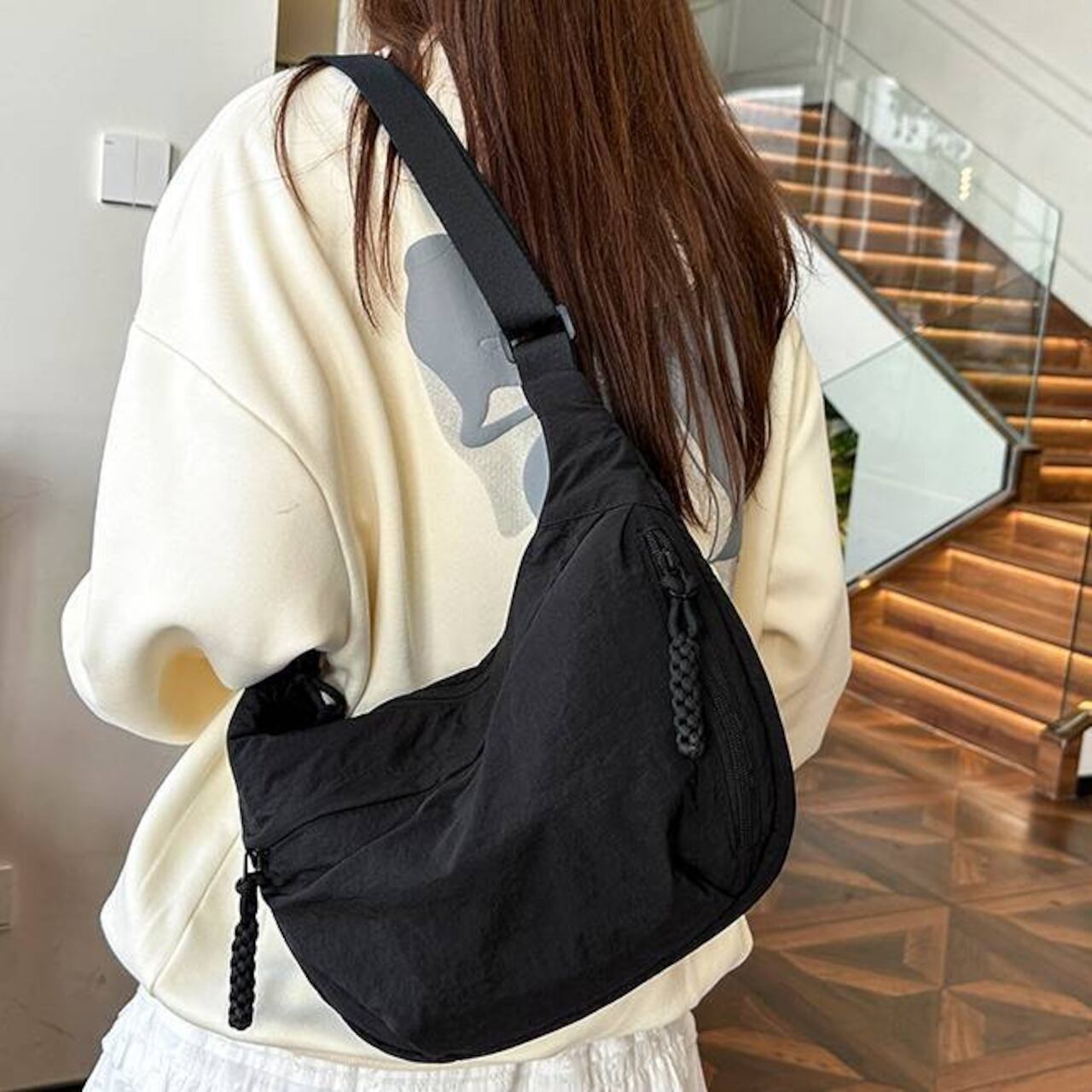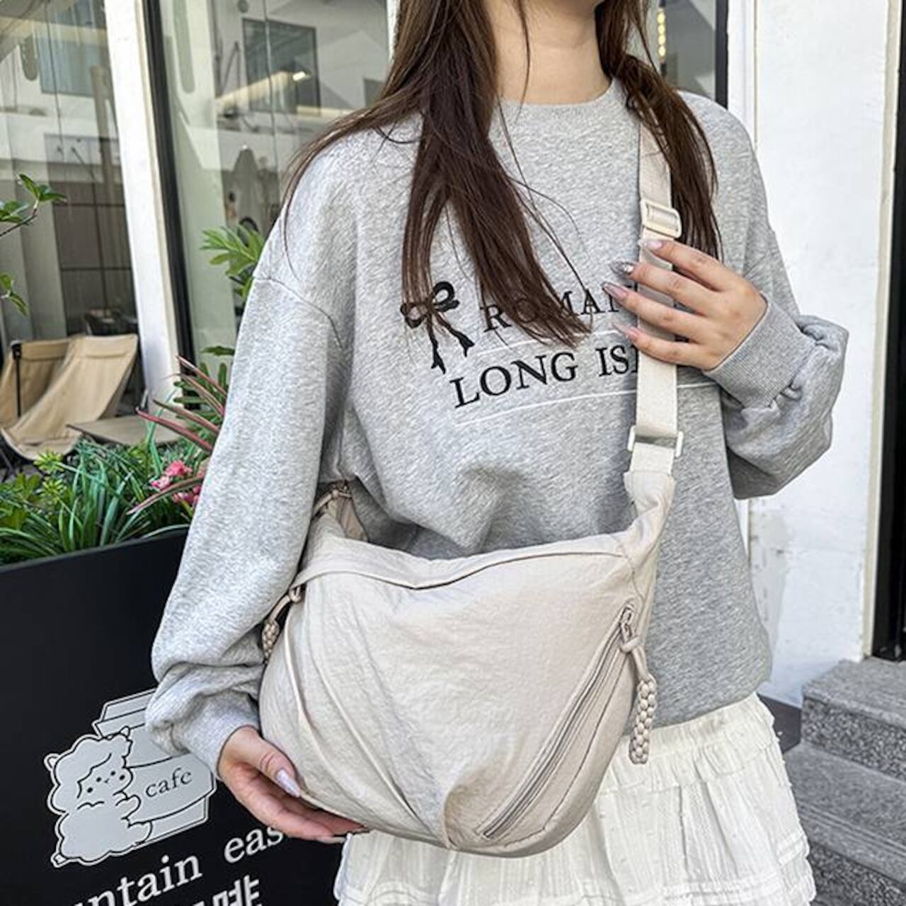 毎日のコーデにすっとなじむ、軽量でやわらかなナイロンクロスボディバッグ。シンプルな無地デザインと程よいボリューム感で、カジュアルからナチュラル、韓国ファッションまで幅広いスタイルにマッチします。身体に沿うようなフォルムで、長時間の外出でもストレスなく使えるのが魅力です。