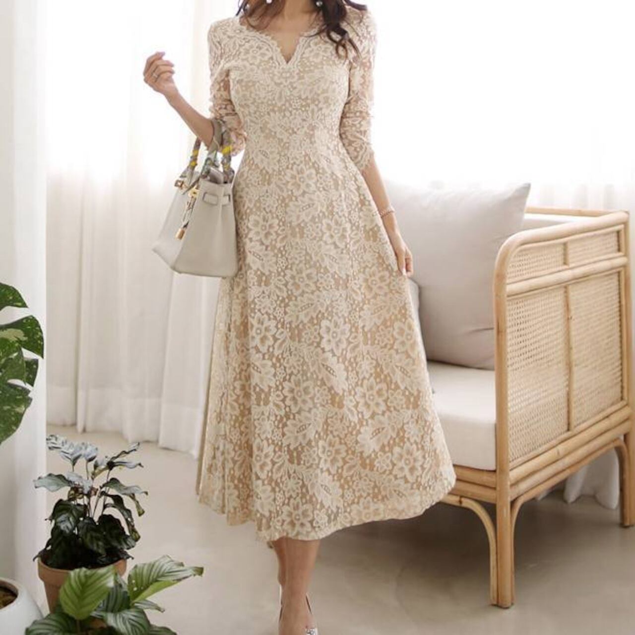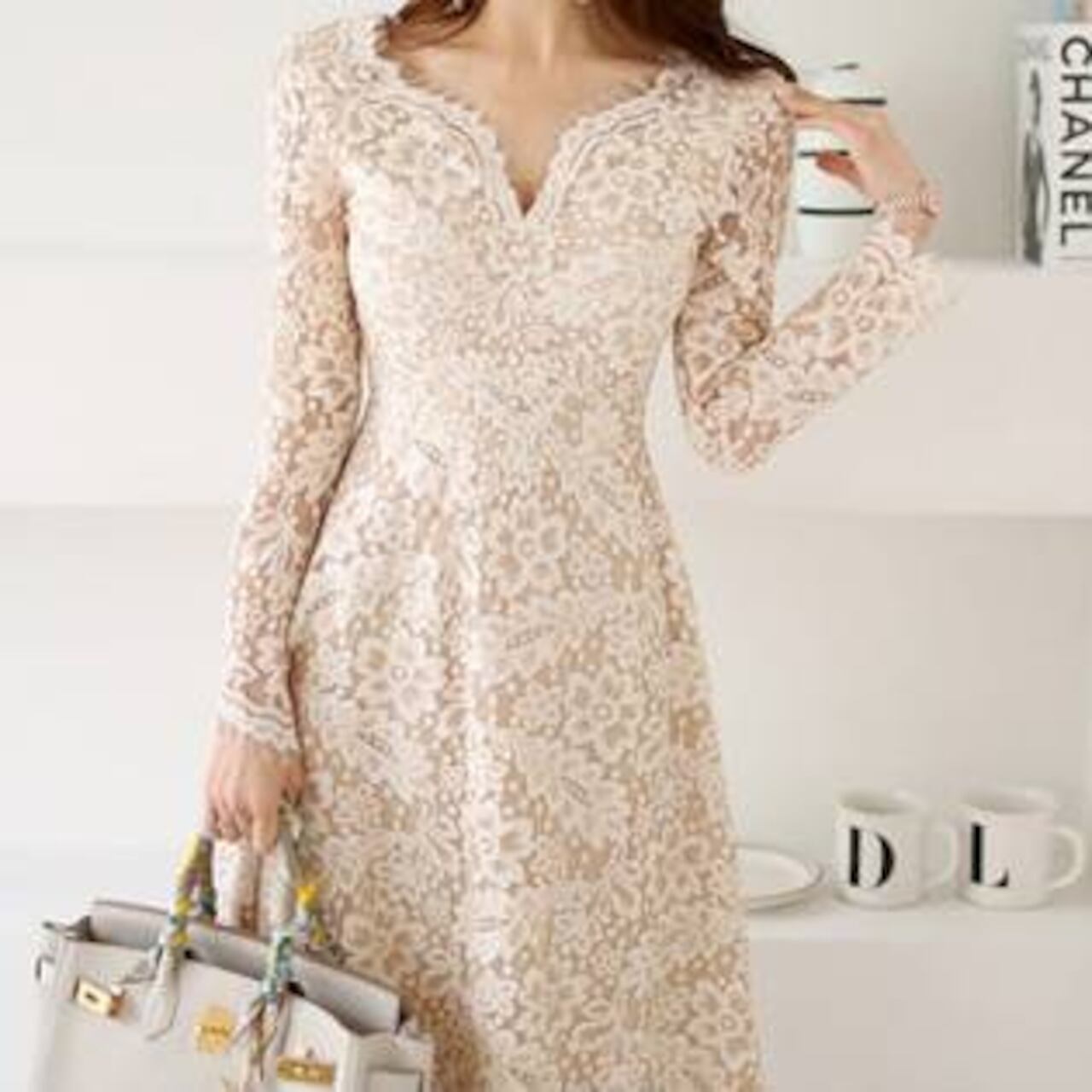 繊細な総レースが贅沢にあしらわれた、大人の女性の魅力を引き立てるミドルマキシワンピースです。ナチュラルで柔らかなベージュカラーが肌なじみよく、上品さを際立たせながらも華やかな印象に仕上げてくれます。デート、女子会、お呼ばれ、特別な1日にもぴったりの華やぎワンピースです。