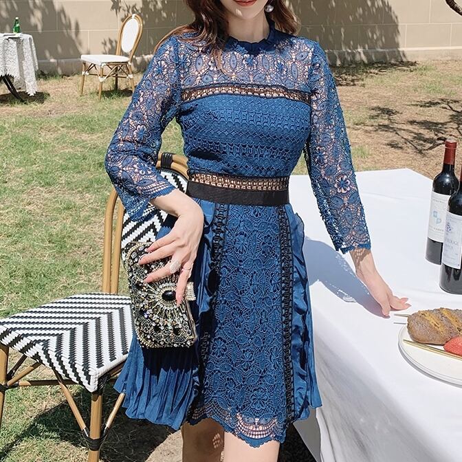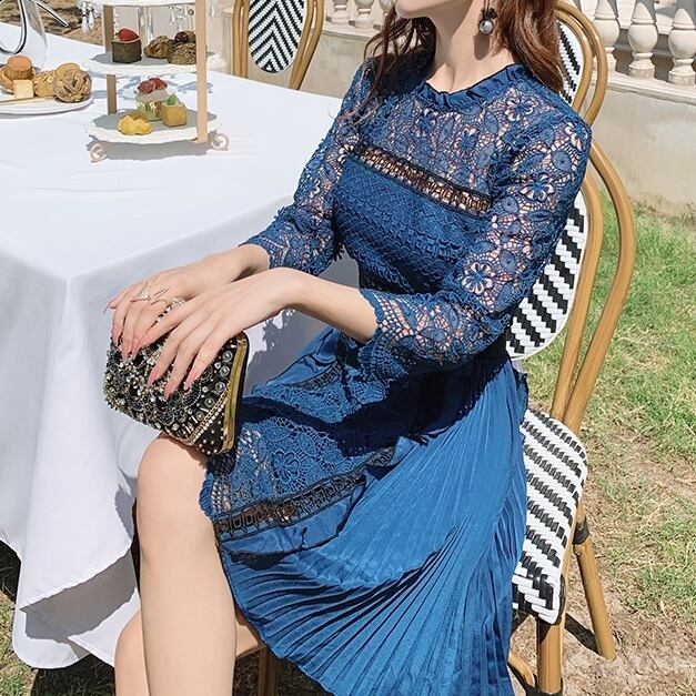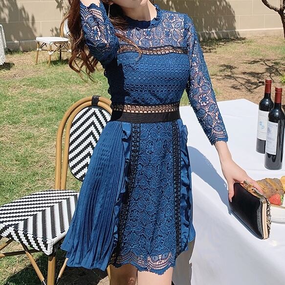 レース&プリーツのミディアムワンピース。