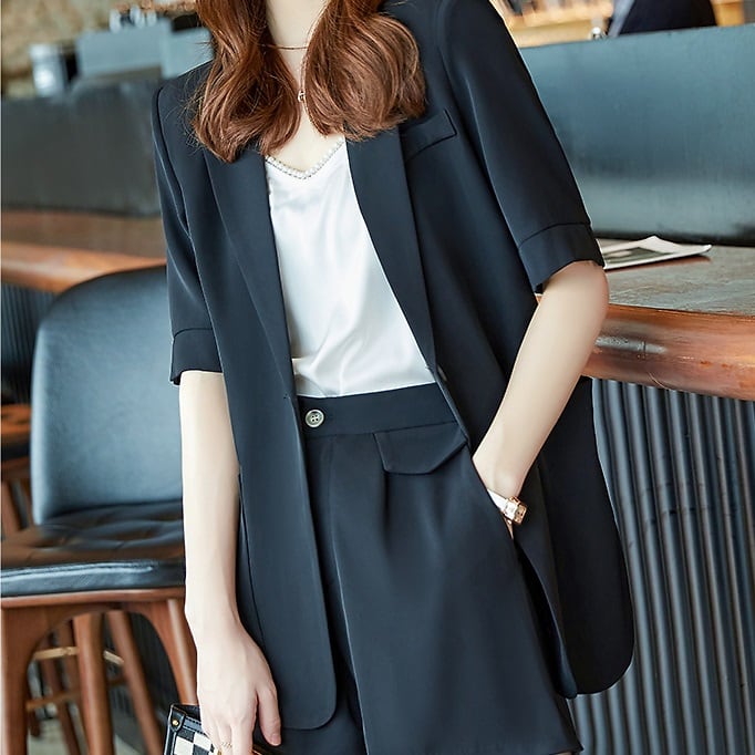 ジャケットとショートパンツのパンツスーツ。