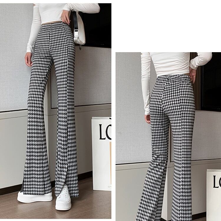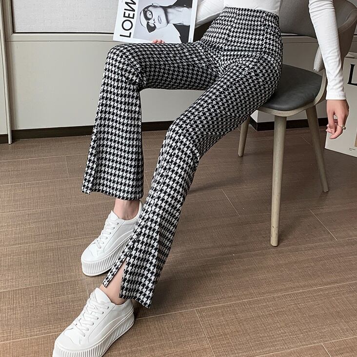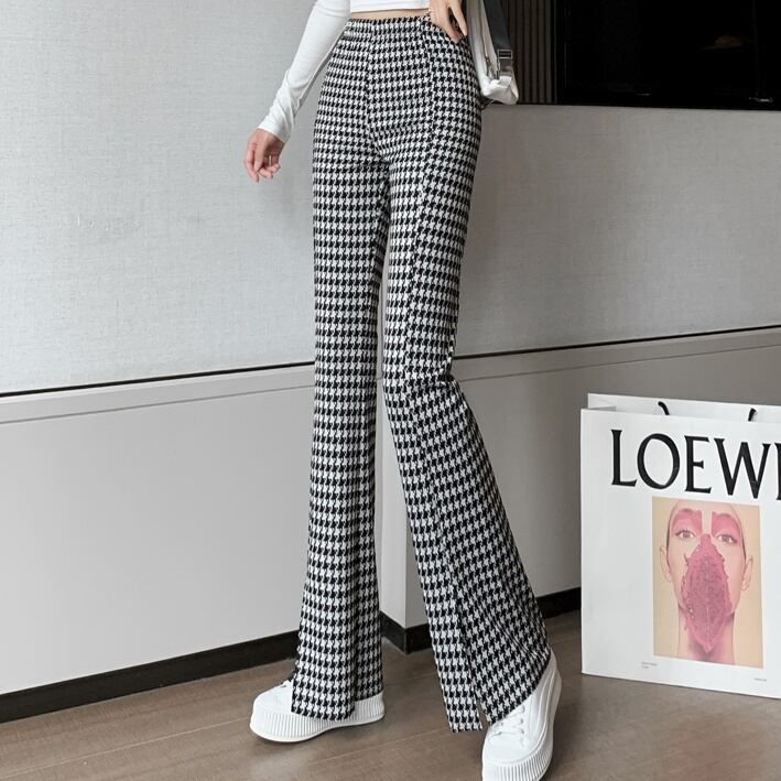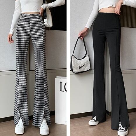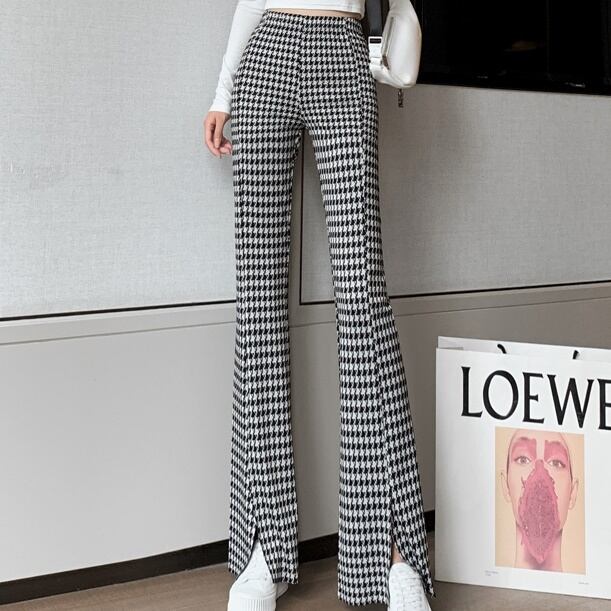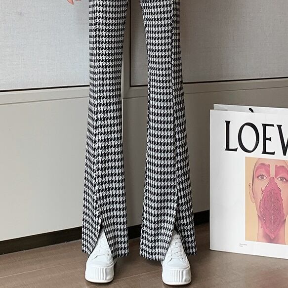 フレアパンツ レディース 春夏 秋冬 春 夏 秋 冬 黒 ボトムス パンツ ベルボトム ハイウエスト ラッパパンツ シンプル 千鳥柄 スリット タイト 美脚 脚長効果 きれいめ 大人 ブラック 千鳥 韓国ファッション 通勤 OL カジュアル オフィスカジュアル ウエストゴム オフィス OL S M L XL 2XL ズボン スーツ C-PSS1035