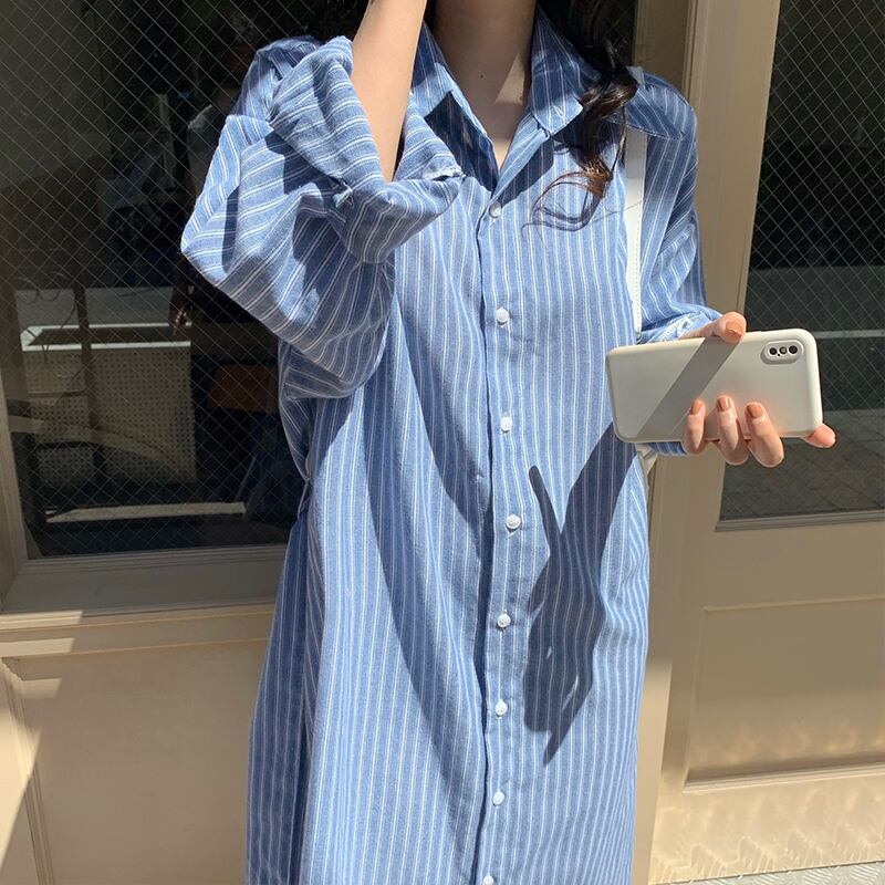 商品名:ウエストリボン ストライプ ロング シャツワンピース
