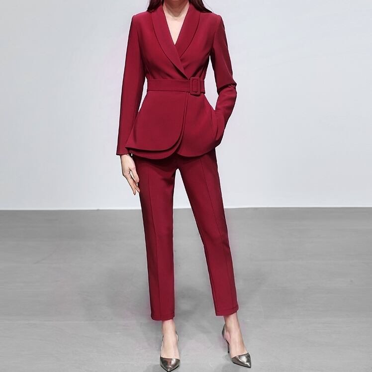 ジャケットとパンツのパンツスーツ。