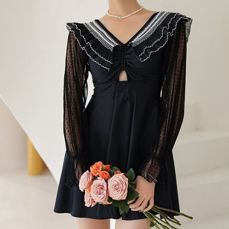 ビッグ襟Vネックのシースルー長袖ワンピース 水着